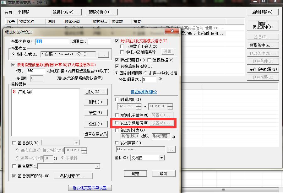 发送手机短信功能见附图。ps:鉴于您这种情况,建议用手机监控助手APP,一目了然。http://www.weistock.com/bbs/dispbbs.asp?boardid=2&Id=64077