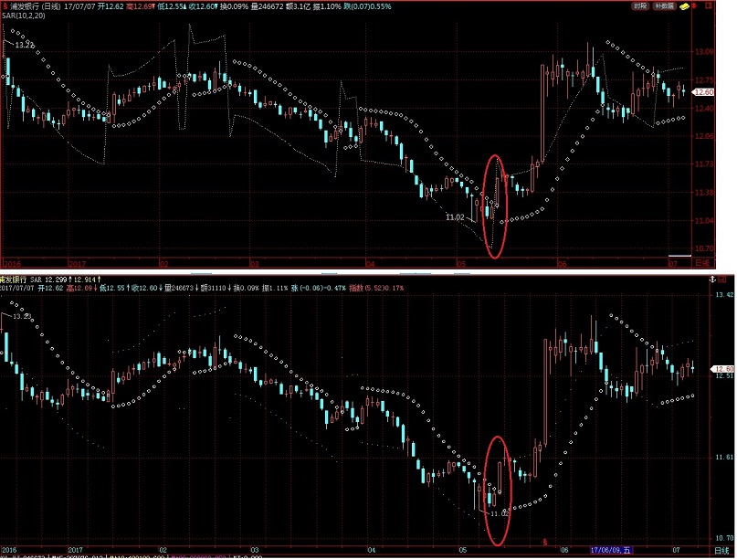 bb: if(SAR(10,2,20)>c,SAR(10,2,20)*0.95,SAR(10,2,20)*1.05),POINTDOT ;
