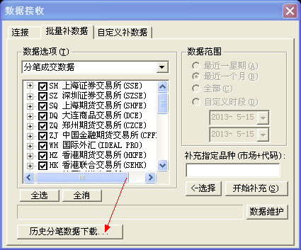 然后在工具 数据补充 进行历史分笔的补充