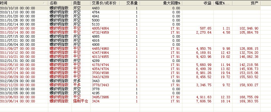 我是用了文华的KD金叉买进,死叉卖出这一思路测试,同样也是用金字塔的KD金叉买进,死叉卖出,测试品种为螺钢日线指数,时间为20101015-20130615