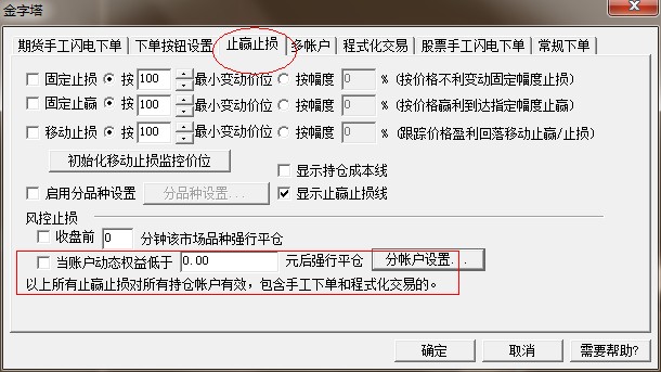 另外,点击菜单栏交易-下单设置进入止盈止损设置界面也可以根据账户资金强平