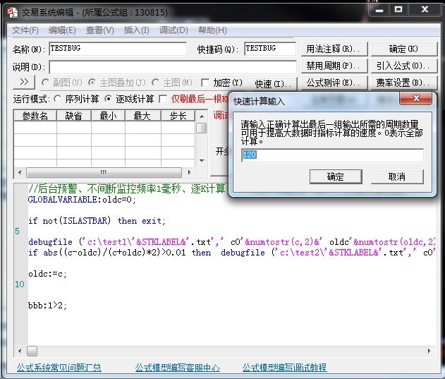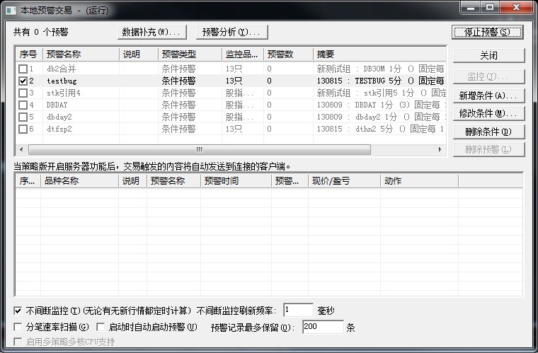 //后台预警、不间断监控频率1毫秒、逐K计算(不勾选仅刷最后一根)、快速计算设置为120
