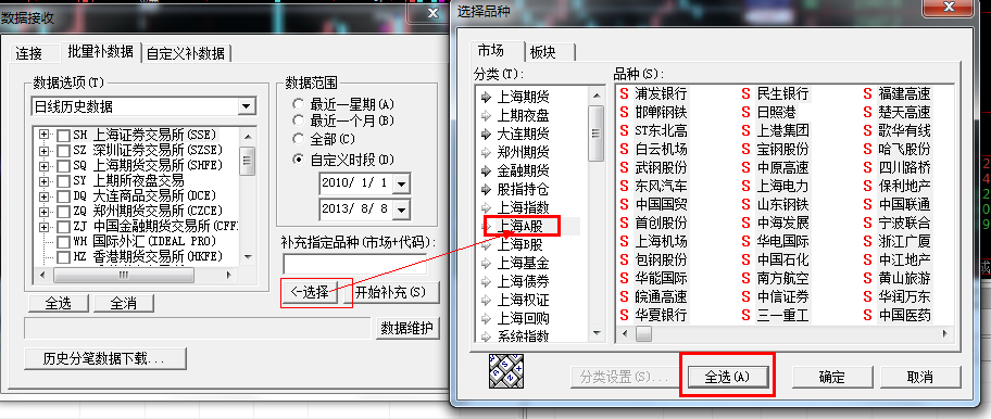 请问,金字塔股票补充数据,上海A、深圳A是分开的,怎么一次整体补充全部A股?
