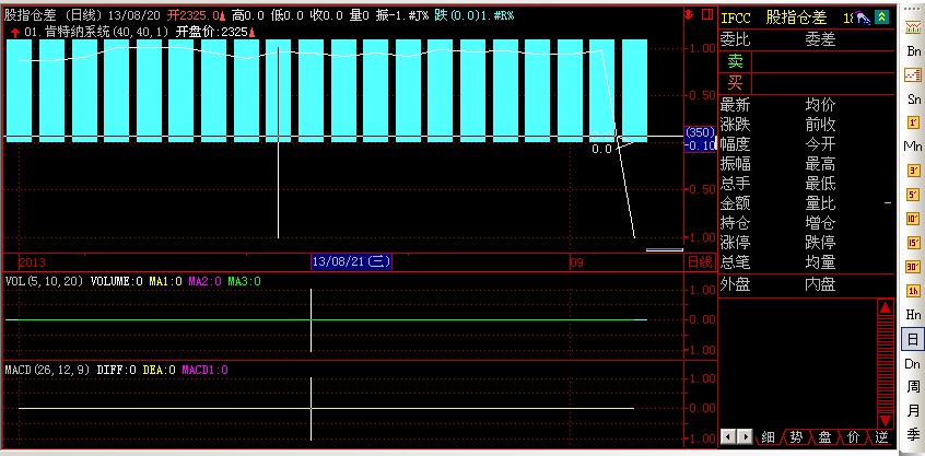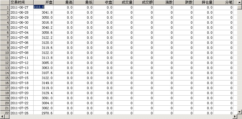 您好,绿色长条就是K线图,您高/低/收全是0 然后开盘价3000多,Y坐标拉扯很长导致的。