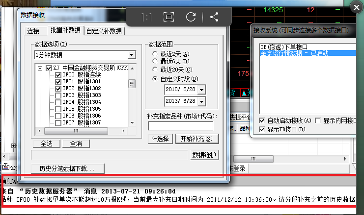 例:我们现在补充2010/6/28至2013/6/28内的1分钟周期数据,股指1分钟每天是270根k线,3年的数据很明显会超过10万根的限制,我们点击开始补充无法补充完整,相应在消息窗口会有下图提示,此时我们应根据提示对数据进行分段补充。