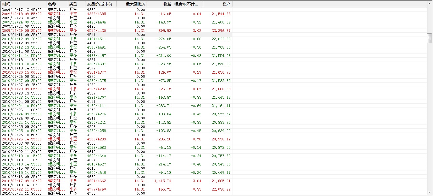 这里是另外一个策略的,从回撤图上可以看到历史最大回撤值是1485.52,那么从交易明细当中,版主主要看2010年1月11号,到2010年3月15号,这里的累计回撤值我计算了一下,就已经达到了1747元,而且这是平仓回撤,如果算浮动回撤,则回撤值会更大,怎么也不可能是1485.52 。这是普通版的,很明显这是一个非常大的漏洞。希望你们能够尽快派出解决。