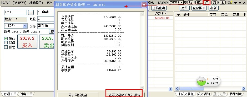 持仓栏,右上测,详/查看交易帐户统计报告,如下图所示