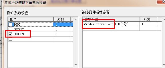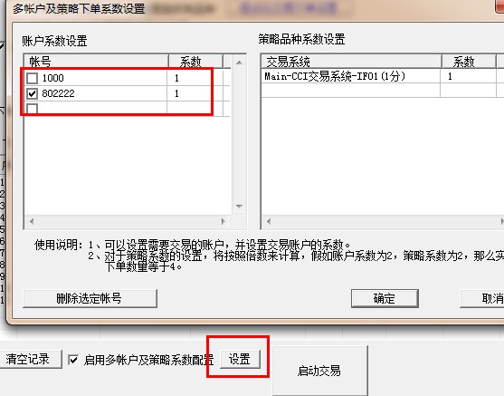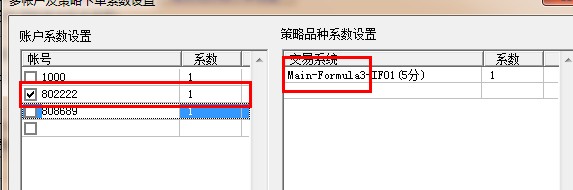 图表运行模式下面有个多账户及策略系数设置,如果您那种不同帐户运行于不同策略的话用多个框架模式,加载不同的策略对应的多账户系数设置这里选择要启用的账户即可