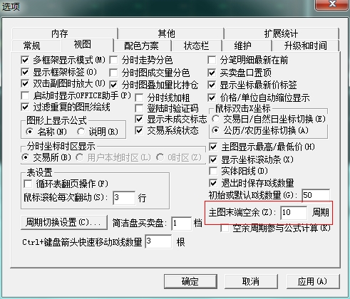 另一种你点开工具-选项-视图,把主图末端空余周期填上10个。