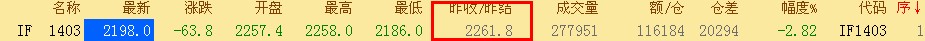 图片点击可在新窗口打开查看您好,IF1403,您截图的上周五结算价是2284.40,我行情软件上周五的结算价是2261.80,为什么会有