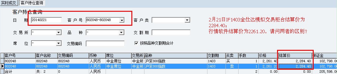 2月21日金仕达模拟交易柜台结算价为2284.40,行情软件结算价为2261.20,请问两者有