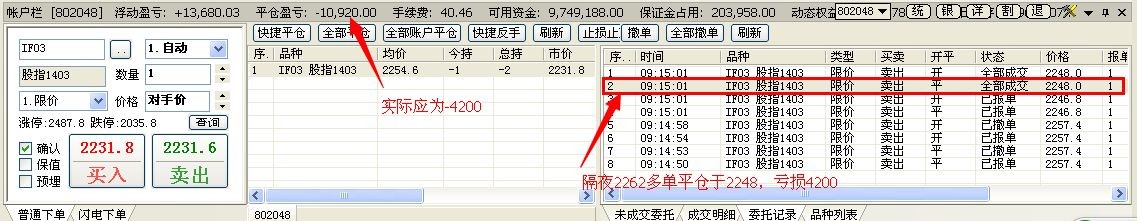 请教:股指上周五多单2262,平仓2248,实际应亏损4200元,怎么显示亏了10920元。