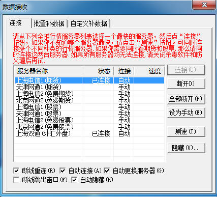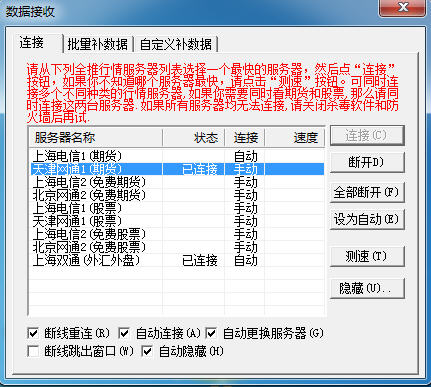 问题在于:1、“天津网通1(期货)”前面的状态是“连接中”,然后又有一个对话框跳出,里面是“要不要连接这个服务器”的意思,具体我忘了,我没有截图。奇怪的是框架中的数据还是不断在动,好像还在推送,那么如果在这种状态下,有信号产生,图表程式化还会下单吗?这种状态究竟是连接上了还是没有连接上?我设置的“自动”怎么不去连接而去连接“手动”的服务器?