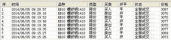 2014-06-05 11:25:57.859    【回报】15000020 : rb1410 - 已成交 5 价格:3040 平 买