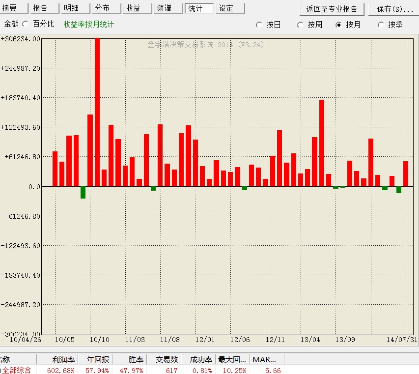 简易报告中“统计''栏的”按月统计''是如何计算的?其月红绿柱是指平仓收益吗?统计时是不是在自然月最后一个交易日按强行平仓的结果来统计的?