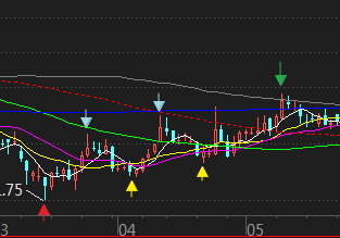 如图,不设置10%止盈的情况下,只交易了一次(红绿箭头)。其间的连续买入信号(黄色箭头)没有再开仓或加仓,交易次数1次。