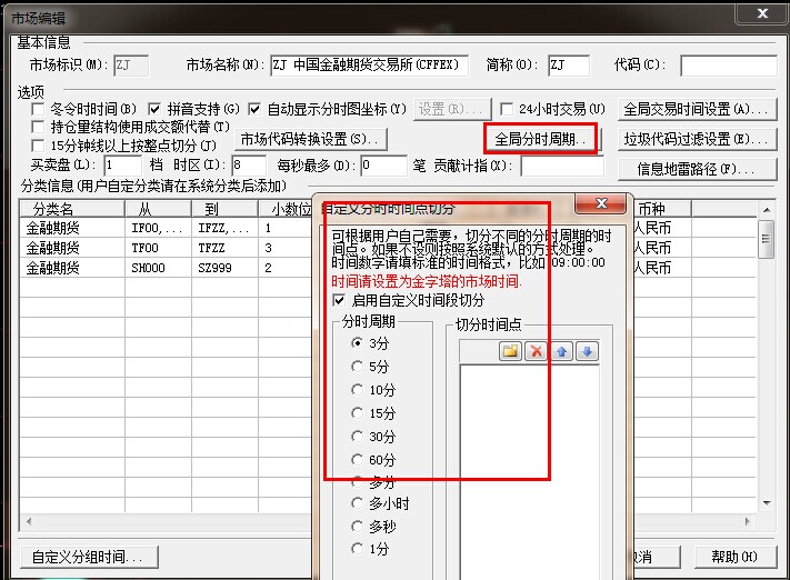 工具=》市场与板块-》中国金融期货交易所-》编辑-》全局分时周期 切分k线