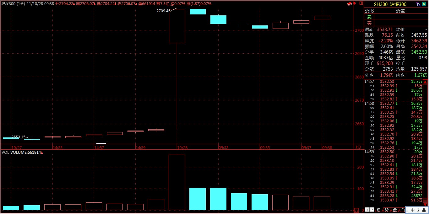 sh300的2011年10月28日9点31分的1min数据有误,应该不存在这么长的下影线,可以参考上证指数或者中证流通进行对比