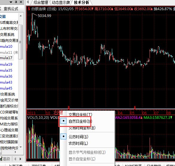 切换到日线周期后 在时间坐标轴点右键 勾选自然日坐标
