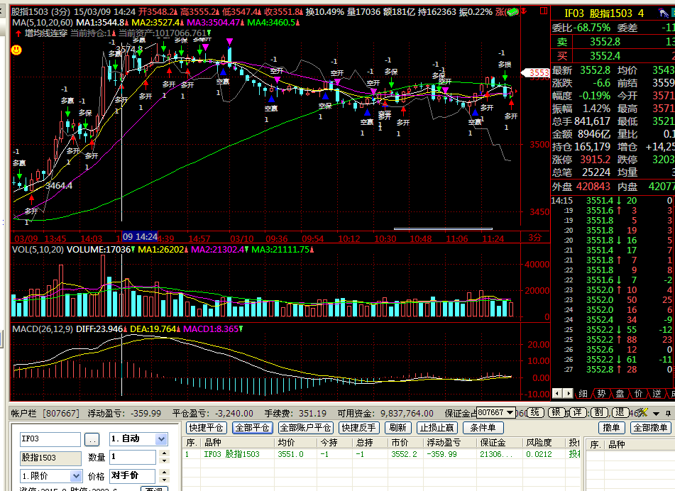 2015-03-10 13:48:02.146    【回报】807667 : IF03 - 正在申报 1 价格:3552.600 开仓 买入