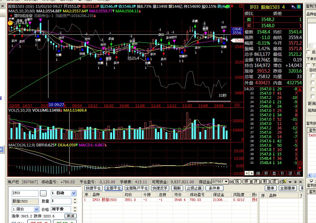 2015-03-10 14:18:02.396    【回报】807667 : IF03 全部成交 1 价格:3551.0 开 卖