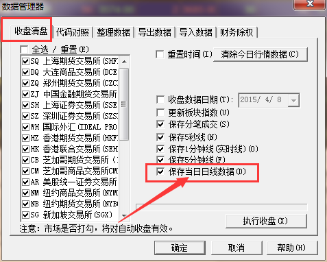 是市场没有勾选,没想到这里需要勾选。虽然没有收盘成功,但是打开的品种的周期数据还是会自动保存,所以我一直没有意识到收盘没有成功。谢谢!