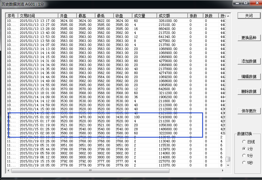 AG01 2015/1/15有日K线,但切换到分钟K线没有这天的任何K线, 重新下载后问题依旧!