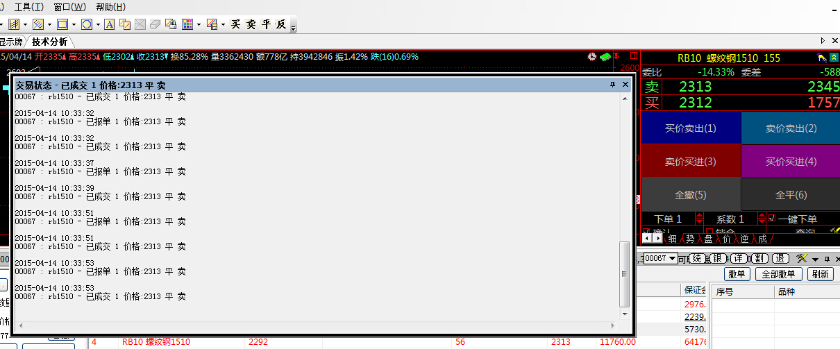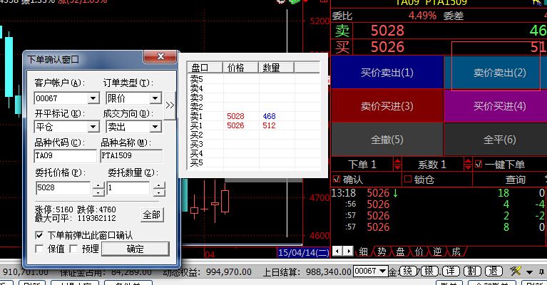 昨天晚上算是第一次真正开始用金字塔的闪电一键下单交易,感觉速度很快,也能实现自动撤单下平仓指令,但是有个问题不能明白,如下:比如我开了多单,然后卖价卖出,果然是按照卖价把平仓单挂出去了,但是我再按一次按照卖价卖出的时候,发出的指令却是按照对手价即买价立即给成交平仓了,连续几笔,我就有点迷茫了,因为自己按错数字了,然后就用鼠标,结果是相同的,第二次点相同的平仓方式无论持仓多空都是按照对手价给直接平仓,为了确认这个问题,我把一键下单改成下单需要确认,结果开仓后,按第一次挂单平仓时弹出确认窗口,结果第二次再按同样挂单平仓时,确认窗口没有弹出,而是直接以对手盘的价格直接给平仓了,这个到底是什么原因?