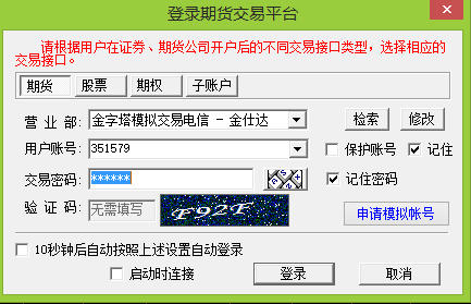 金子塔的模拟柜台有问题,暂时登录不了。你可以联系期货公司,开通模拟账号。