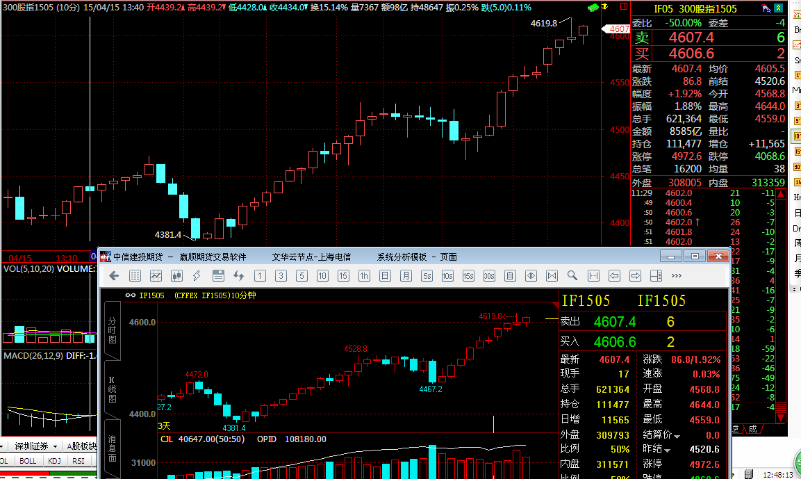 是IF1505  10分钟k线   4月16日的13:10到15:15这一段时间,k线不对啊。。。