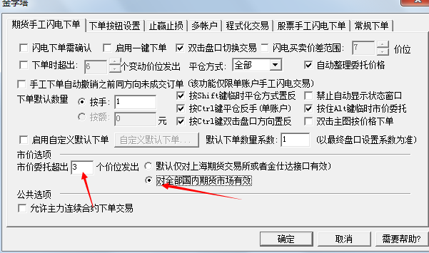 菜单“交易”-“下单设置”-“期货手工闪电下单”-“市价选项” 如图设置。一个设置点数,一个勾选对全国期货市场。 前提是你采用的是“市价”报单。这个应该可以满足你。