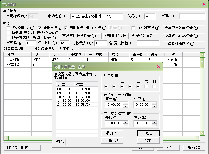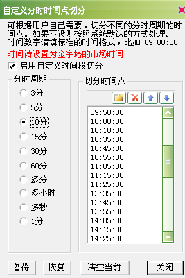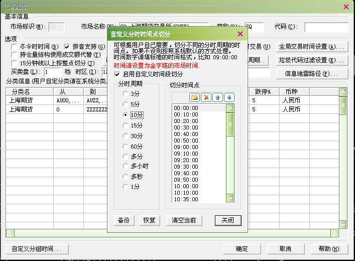 请问这两个图里的划分怎么设置?沪铜指数,10分钟周期,我想实现的时间划分点:夜盘和默认的一样,只是白天的改成09:10.09:20,09:30,09:40,09:50,10:00,10:10,10:35,10:45,10:55,11:05,11:15,11:25,13:35,13:45,13:55,14:05,14:15,14:25,14:35,14:45,14:55,15:00