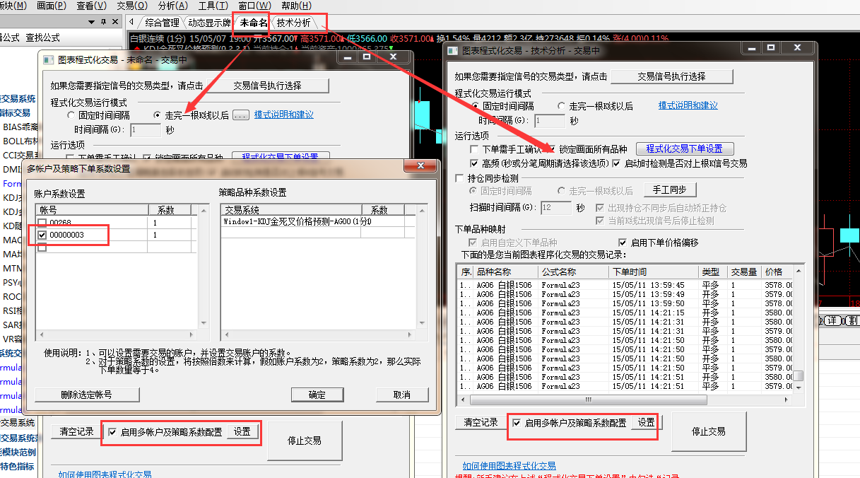 2,原来的技术分析做品种a 加载策略,图表程序化交易启用多账号及策略系数配置里勾选账户a