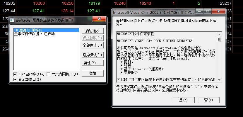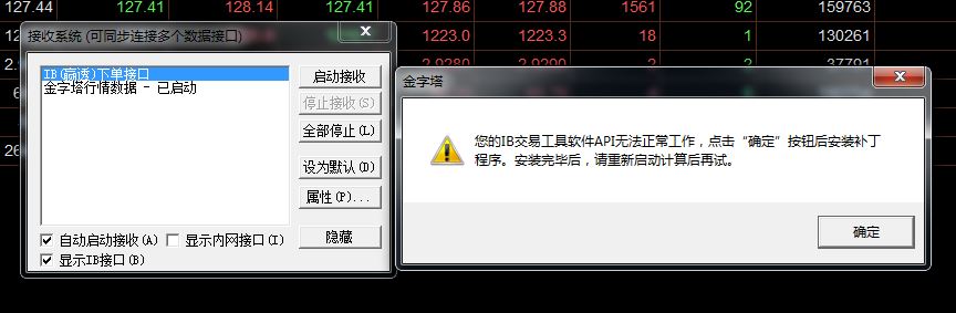 4、安装完补丁,IB下单接口变成“已启动”状态。但如果要双击进入“IB数据管理器”,或者点击“停止接收”,就会出现以下的报错,同时金字塔自动退出。