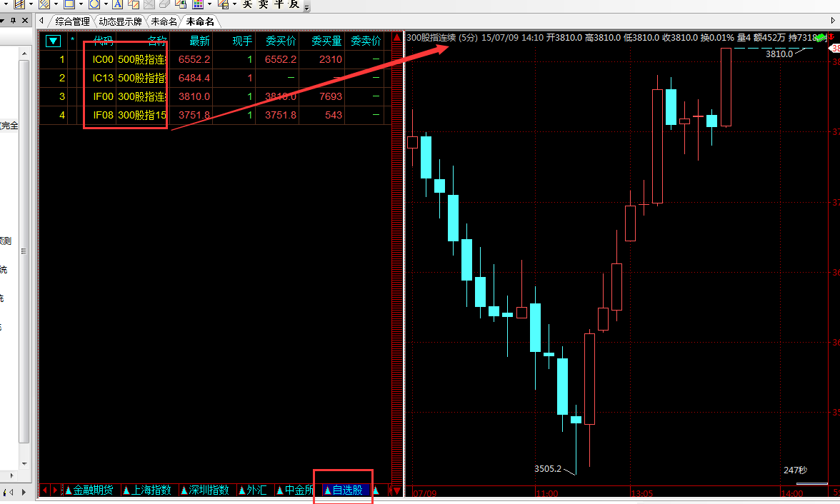 一个框架里切分第一个窗格后,加入一个T显示自选股,另外几个显示k线图,k线图输入要看的具体品种