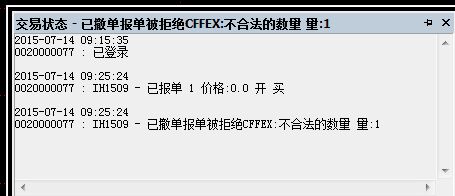 ih09 实盘报单拒绝  发帖心情 Post By:2015/7/14 9:40:52 [只看该作者]