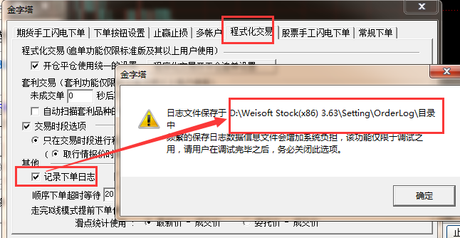交易-》下单设置-》程序化交易里勾选记录日志,勾选时保存位置有提示