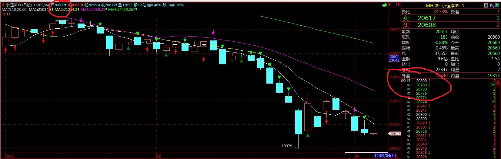9月4日小恒指,9:15开盘。分时成交第一笔是20800,日K上显示的开盘价是20600。