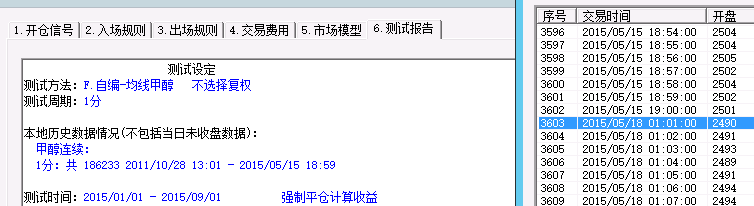我贴的图上显示选的测试时间是2015/1/1 - 2015/9/1,本地历史数据显示只到2015/5/15,右边图上数据可以看到2015/5/15日往后是有数据的。