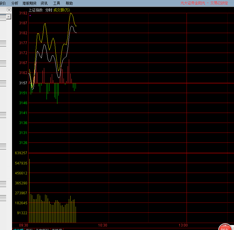 通达信上证指分时图中,白线是“上证指数”,黄线是“上证领先”。