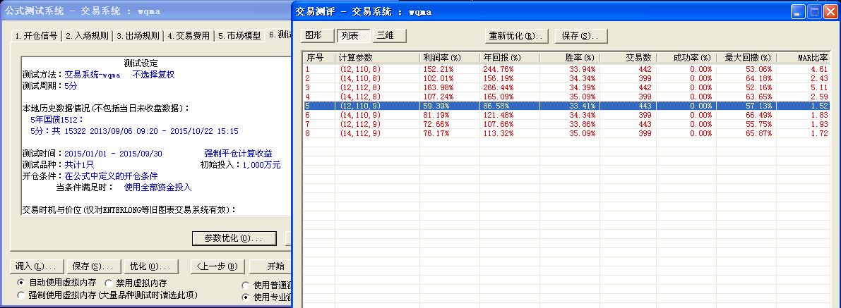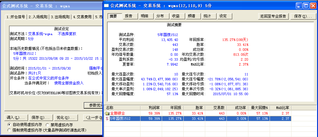 五年国债1512这个品种我的本地数据是从2013年9月6日到2015年10月,而我优化和回测的时段都设置的是2015年1月1日到9月30日。这些在截图中可以看到。所以我想应该不会是时间问题导致的。