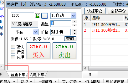 目前只能在账户窗口或者通过菜单中的“交易-->普通下单”来手动下单,稍显麻烦。闪电下单虽然好,但不能方便下停损单。