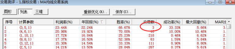 这个是对均线MA的优化,ma(c,3)和ma(c,5)金叉死叉不可能只出现三次吧……测试时间是2014年11月至今