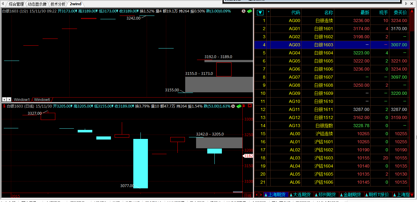当你双击左边的 具体品种时 会在左边的K线图中显示相应的不同周期