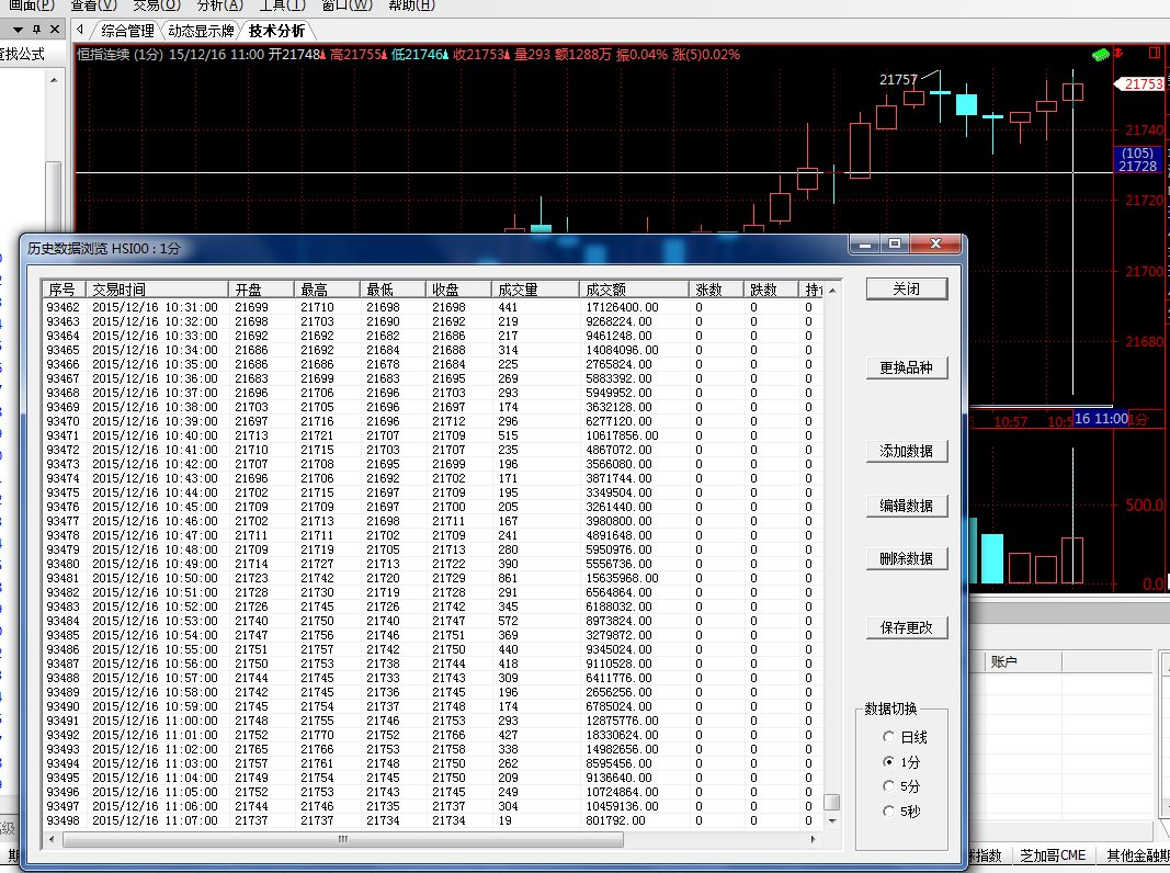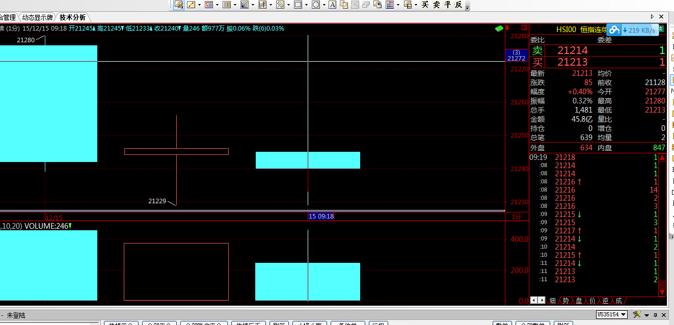 这边我设了下恒指的9点15到9点18分的,盘口那边行情跳动是正常的,但是k线并不会刷新。