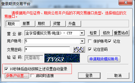 这个设置以后,到时间后会自动弹出登陆对话框,图中的这个10秒后启动也要勾选上,软件才能在弹出登陆框后,倒计时10秒登陆