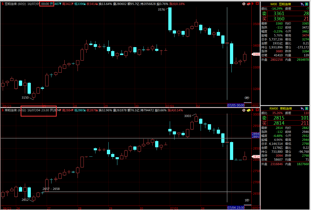 标题:请问,为什么豆粕和菜粕夜盘收盘时间都是23:30,但是60分钟线的收盘时间却是不一样的