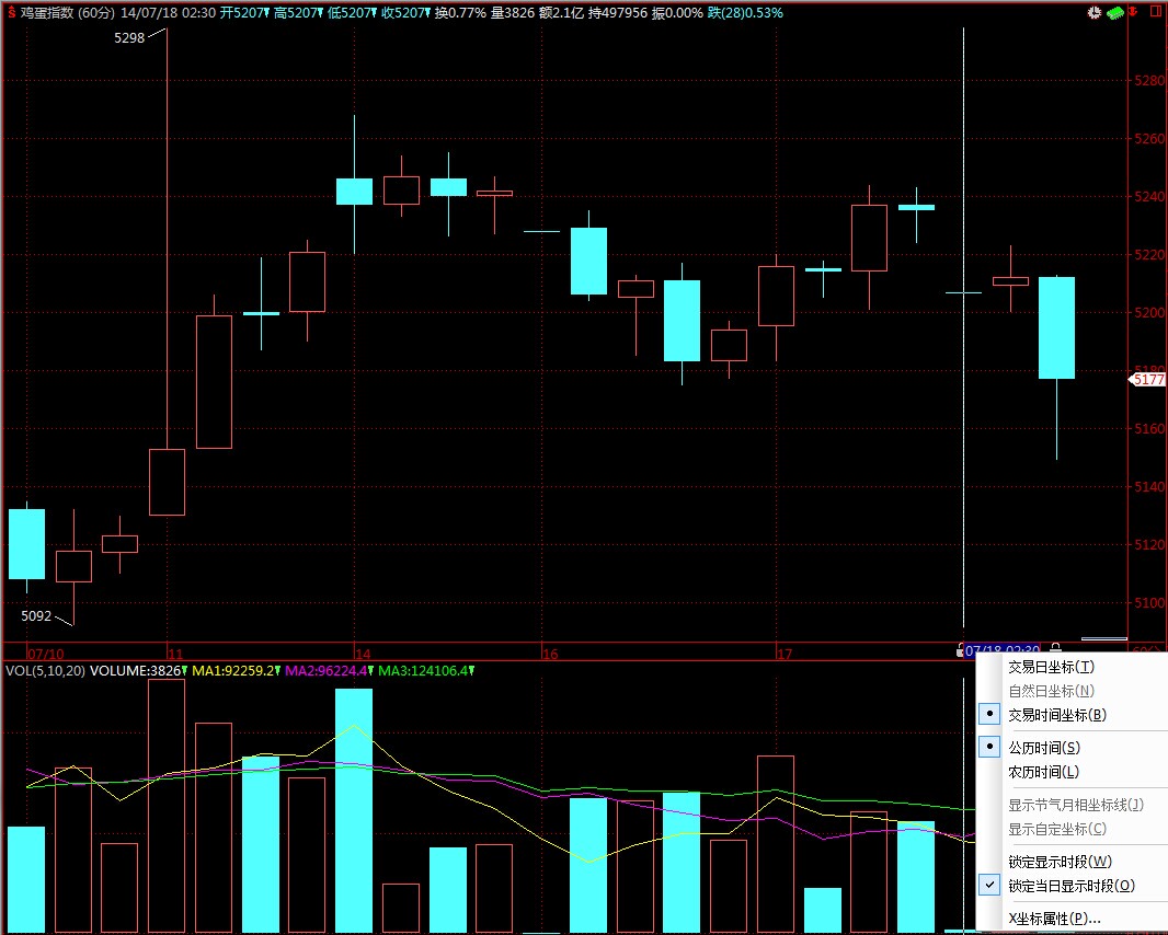 工具-市场与板块-大连市场-编辑,看下分时周期里60分钟的自定义切分这里你有改动过?