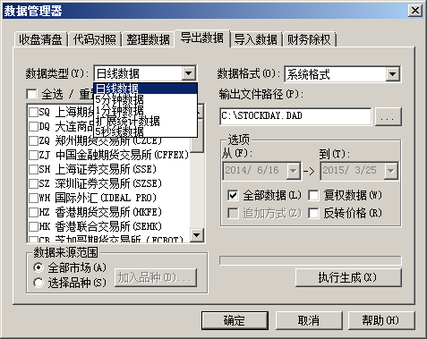 数据管理里边可以对数据进行导入导出的动作,但是周期上的选择没有分笔周期的。