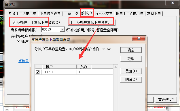 交易-》下单设置-》多账户勾选手工复合下单设置账号及系数